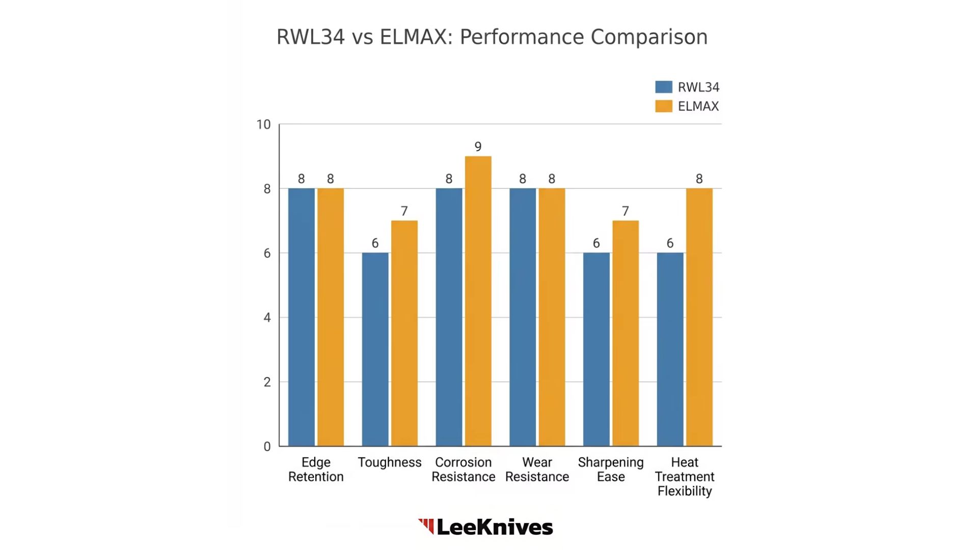 Summary: ELMAX features higher carbon and chromium content for enhanced edge retention and corrosion resistance, while RWL34 offers higher molybdenum for improved toughness and heat resistance.