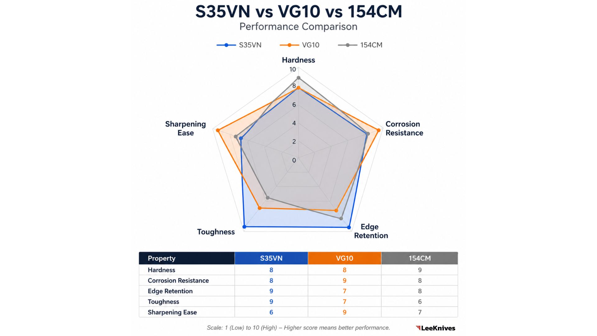 Data Sources: Crucible S35VN DataTakefu VG10 Specs, and Hudson Tool 154CM Datasheet.